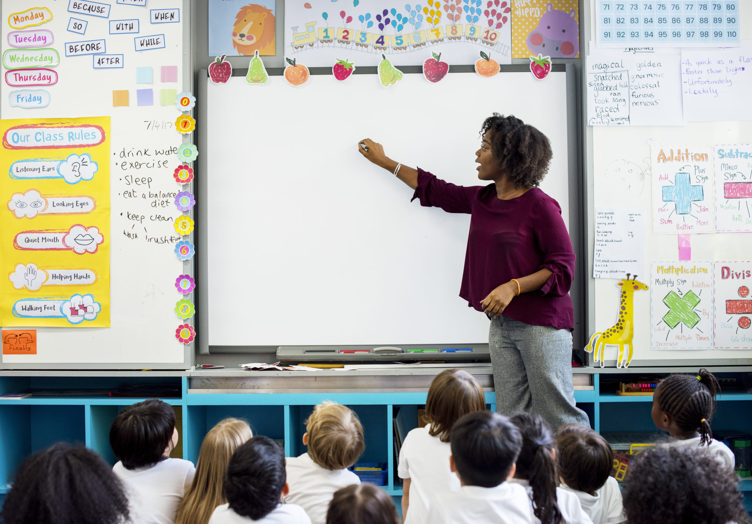 Kindergarten students sitting on the floor listening to teacher